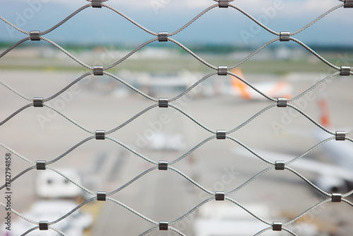 © em113, Fototapeta premium Metal security mesh fence with blurred airport runway background