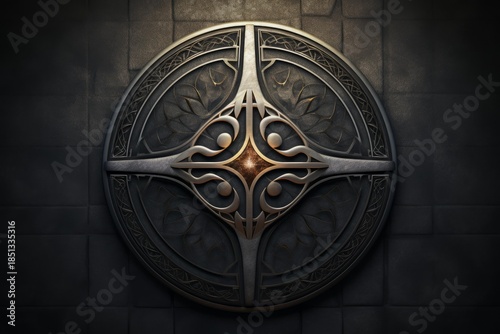 © juliars, Naklejka premium Metal shield with intricate patterns and glowing center featuring strong concepts of power and protection