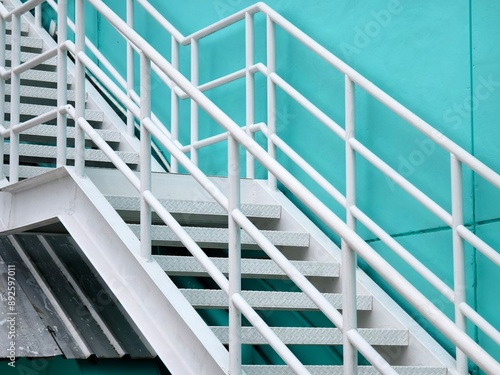 Fototapeta premium Metal stairs to blue building against sky and clouds