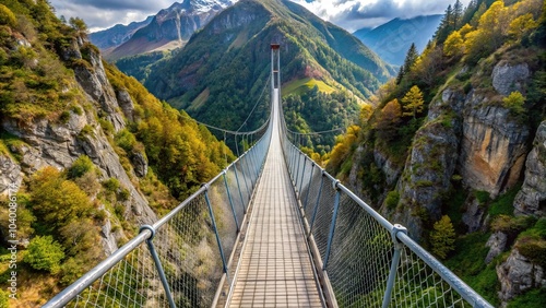 © Hugnaka, Obraz premium Metal suspension bridge in Himalayan mountains trail, high angle view