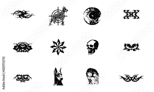 © Virgiawands, Fototapeta premium Metal tattoo set, gothic cyber body ornament shapes kit, Celtic vector abstract Hawaiian sign. Maori sleeve symbol y2k Polynesian metal abstract symmetry swirl wing.