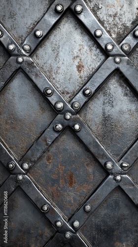 Fototapeta premium Metal Texture: Diamond Pattern, Steel Plate: A detailed close-up shot reveals the intricate diamond pattern of a dark metal plate, studded with rivets.