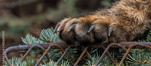 © AbstractAI, Obraz premium Metal Trail Trap With Traces Of Corrosion On The Paw Of A Wild Fur Bearing Animal Mounted In A Cocked State On Green Coniferous Branches Close Up