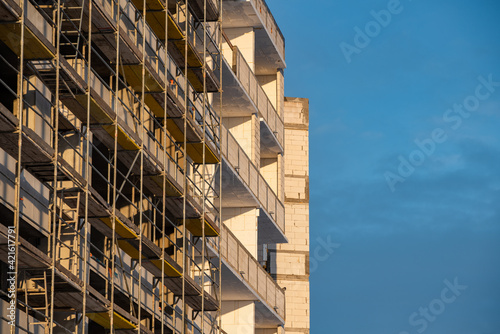 © Jakub, Fototapeta premium Metal-wood scaffolding on the facade of an apartment building against the sky outside
