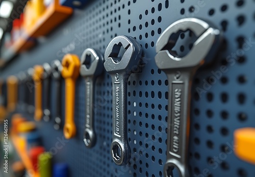 © Diki prayoga, Fototapeta premium Metal wrenches hang on a perforated wall panel