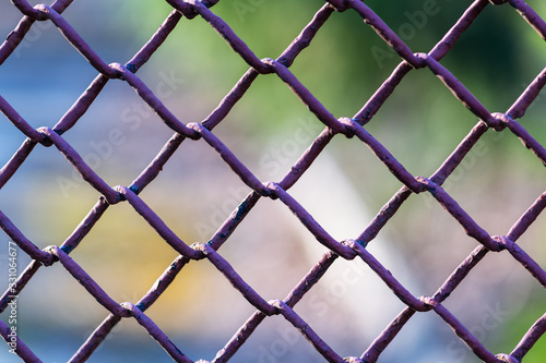 © miroslavmisiura, Fototapeta premium Metallic chain fence link net with blue defocused background