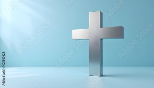 © Yosich1961, Obraz premium Metallic Cross Displayed on Blue Background with Soft Lighting -