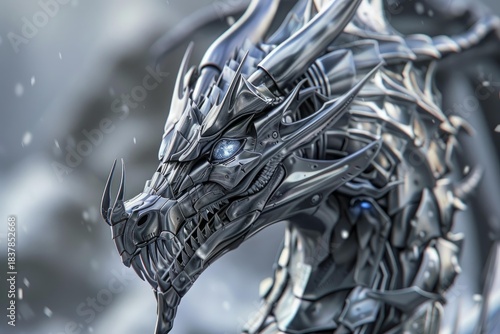 © nsit0108, Obraz premium Metallic dragon head with glowing eyes against a snowy backdrop
