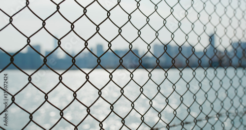 © leungchopan, Fototapeta premium Metallic fencing at seaside in evening