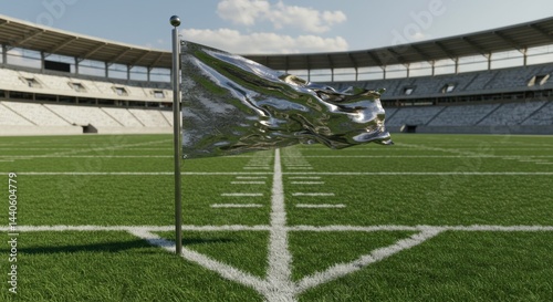Obraz premium Metallic Flag Waving at an Empty Stadium: A Modern Sports Scene