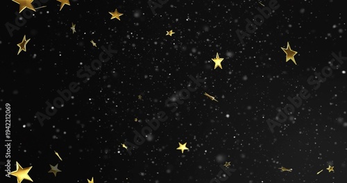 Fototapeta premium Metallic gold stars floating across deep black backdrop with white particle...
