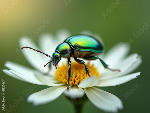 © ZAHL IMAGES, Fototapeta premium Metallic Green Beetle with Iridescent Shell and Fine Antennae Resting on Yellow Daisy Center in Macro Nature Composition
