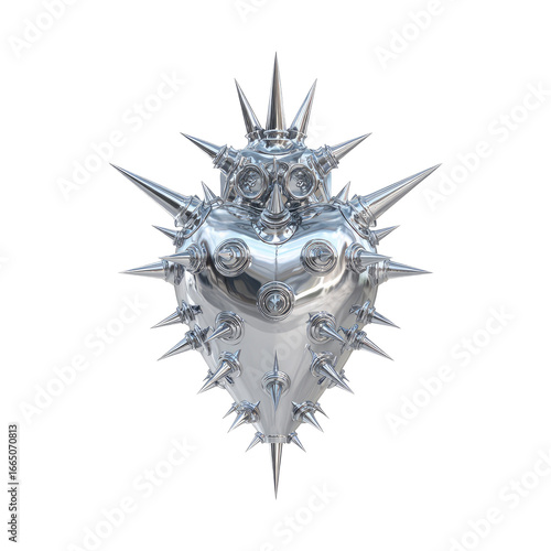 Fototapeta premium Metallic heart with spiky exterior. 3D rendering of a stylized heart, reflective silver, studded with numerous sharp points. Abstract, futuristic, and ornate