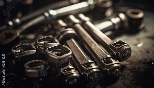 Fototapeta premium Metallic machinery in workshop rusty wrenches and shiny steel bolts generated...