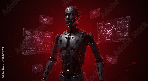 © Aksapix Studio, Fototapeta premium Metallic Robot with Red Digital Interface