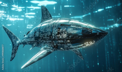 Obraz premium Metallic shark swimming through digital data.