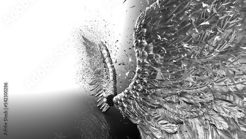 © DRN Studio, Naklejka premium Metallic silver wings with silver particles under black-white lighting background. Concept 3D CG of free activity, decision without regret and strategic action.