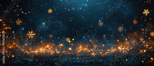 Obraz premium Metallic snowflakes and golden ornaments on a dark navy blue background close up holiday elegance theme vibrant manipulation cocktail party backdrop