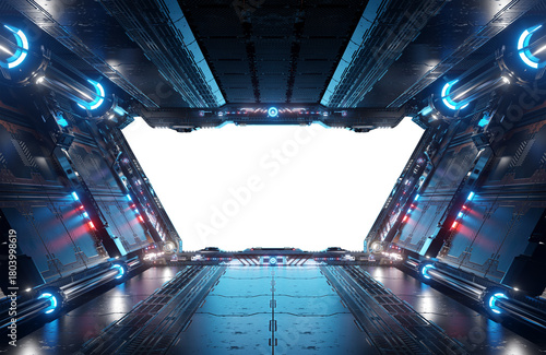 Obraz premium Metallic spaceship interior with isolated cut out transparent window. Glossy starship corridor with blue and pink glowing lights. 3D rendering