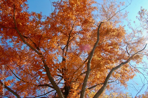 © shinyoung, Fototapeta premium Metasequoia glyptostroboides, the dawn redwood with red autumn color needles, from under the tree