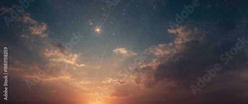 Fototapeta premium Meteor shower at sunset featuring falling meteorites and shooting stars against a cloudy sky