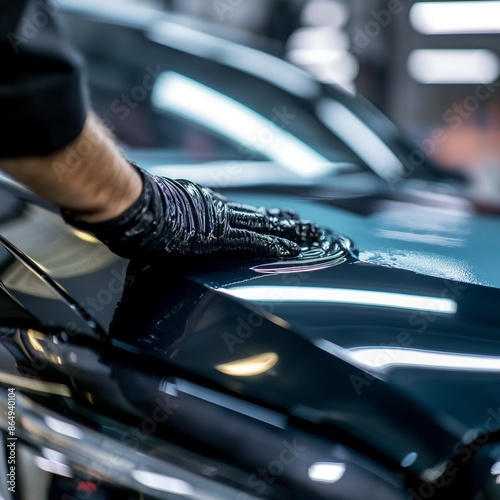 © Laiba's images, Obraz premium Meticulous Hand Cleaning and Polishing Shiny New Automotive Vehicle with Cloth, Car wrapping specialist putting vinyl foil or film on the car, Worker in protective gloves polishing a car