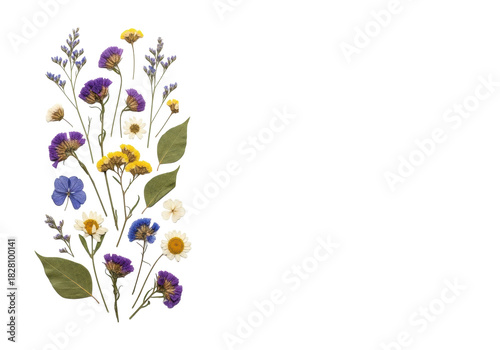 © Anna, Naklejka premium Meticulously arranged dried wildflowers in muted purple, blue, yellow, and white hues with stems and leaves, flat lay on a transparent background with copy space, serene natural beauty concept