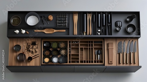 Fototapeta premium Meticulously Organized Drawers Showcasing Essentials in Minimalist Kitchen Setting