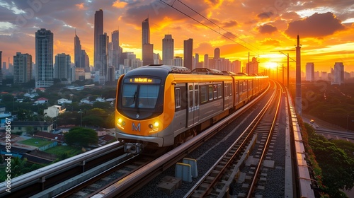 Naklejka premium Metro train at sunrise in cityscape. Metro train traveling on elevated tracks at sunrise, with a cityscape of skyscrapers in the background.