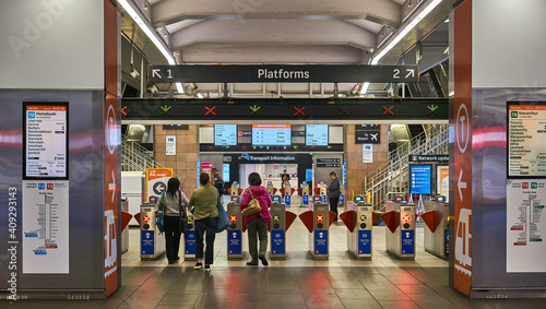 © Carsten, Fototapeta premium Metro, tube, subway, railway entrance to station. Commuters sliding card to enter. Stairs leading to platforms. Guide signs, lights and turnstiles. Sydney, NSW.