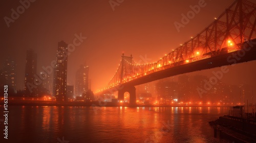 © rookielion, Fototapeta premium Metropolitan Skyline Glow: Street bridge under night haze with glowing buildings