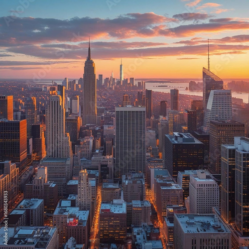 © Aziz, Fototapeta premium Metropolitan towers highlighted by warm sunset glow over the city
