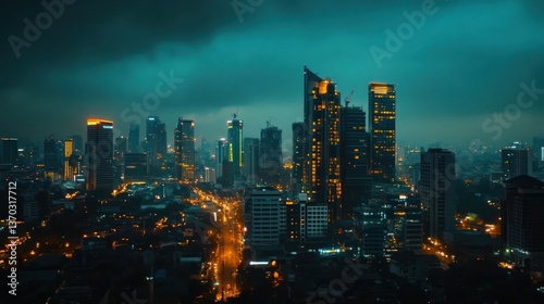 © Syuhud, Obraz premium Metropolitan twilight, urban skyline illuminated under a dramatic sky