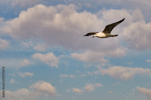 Obraz premium Mewa, ptak morski na niebieskim niebie