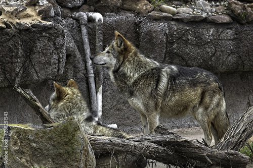 Fototapeta premium Mexican Gray Wolf. Two. Standing and looking to the left.