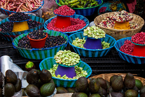 © Daniel, Fototapeta premium Mexican street market displays colorful beans and a lot of fresh avocados in San Cristobal de las Casas, Chiapas, Mexico.