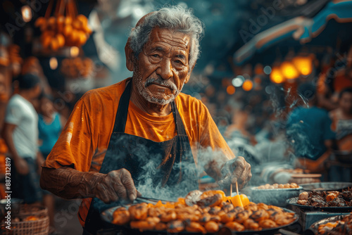 © btiger, Obraz premium Mexican street vendor grilling tacos al pastor in vibrant Mexico City, with locals and tourists enjoying the bustling atmosphere and authentic culinary experience