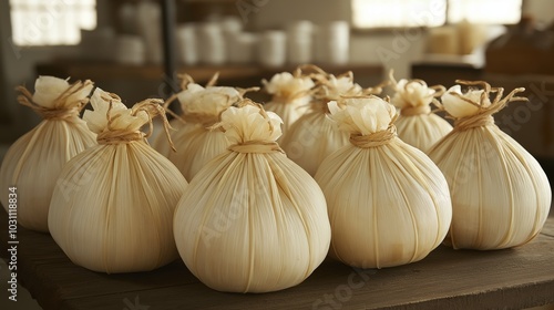 © Irina Kozel, Obraz premium Mexican 'Tamales' for New Year's Eve, traditional corn dough stuffed with meat, wrapped in corn husks