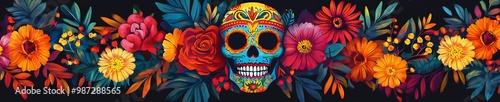 © Chimpanzky , Fototapeta premium Mexican themed banner with a skull and colorful flowery motifs