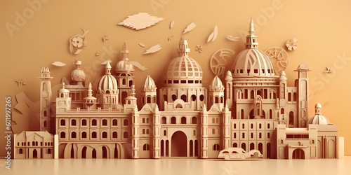 © Noell, Fototapeta premium Mexico landmark paper cut with light brown background , travel, tourism concept, generative ai