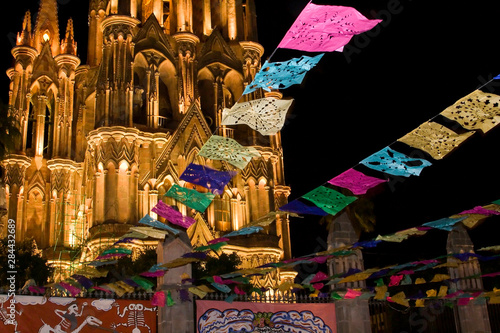 Fototapeta premium Mexico, San Miguel de Allende. Festival banners fly at night in front of...
