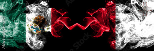 © Vlad, Fototapeta premium Mexico vs Malta, Maltese smoky mystic flags placed side by side. Thick colored silky abstract smokes banner of Mexican and Malta, Maltese