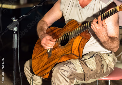 Fototapeta premium Mężczyzna gra zbliżenie gitara akustyczna żółty