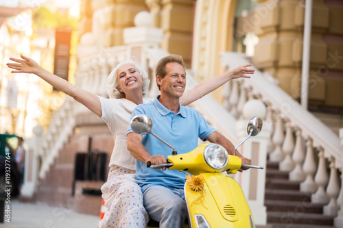 Fototapeta premium Mężczyzna i kobieta jeździć skuterem. Dorosła dama z podniesionymi rękami....