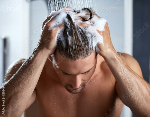 Obraz premium Mężczyzna myjący włosy pod prysznicem