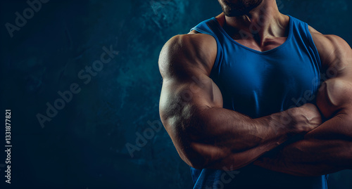 Obraz premium Mężczyzna o umięśnionych ramionach – portret w sportowej odzieży na tle w ciemnych barwach
