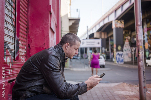 © Herman, Obraz premium Mężczyzna rozmawiający przez telefon w mieście cbd