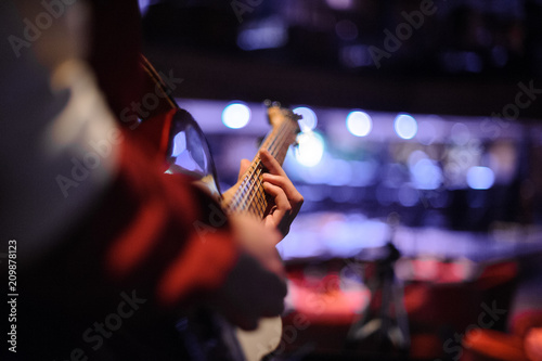 © fesenko, Fototapeta premium Mężczyzna stojący w klubie nocnym z gitarą w rękach