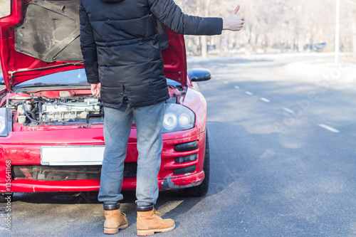 Obraz premium Mężczyzna sygnalizujący problemy z uszkodzonym sportowym samochodem na...