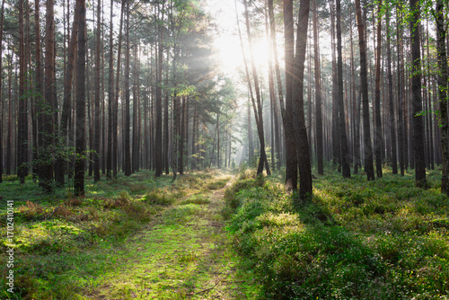 © boguslavus, Fototapeta premium Mglisty poranek w sosnowym lesie. Pomiędzy wysokimi drzewami jest wyboisty, porośnięty trawą dukt leśny, nad nim unosi się opar mgły oświetlany promieniami słońca tworzącymi malownicze smugi światła.